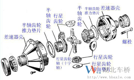 1.差速器作用:當汽車轉彎或在不平路面上行駛時,使左右驅動車輪以不同的轉速轉動,使左右驅動輪相對地面純滾動而不是滑動。